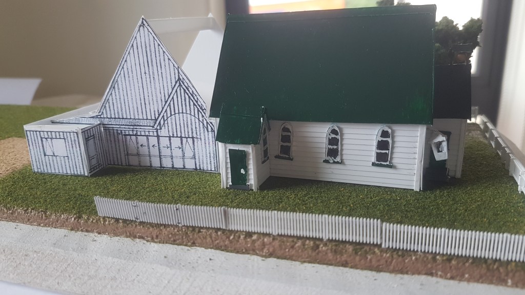 then a Model of the existing building to the scale of 1:160 ” n scale” to be on display in the church building later next month.